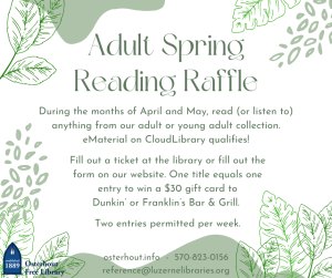 Fill out a ticket at the library or fill out the form on our website (find below!) One title equals one entry to win a $30 gift card to Dunkin’ or Franklin’s Bar & Grill!