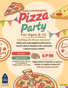 On Monday, March 30th at 6PM, kids ages 8-12 are invited to the Children’s Department for pizza night! Make your own mini pizza, create a pizza craft, and make a dessert pizza cookie!