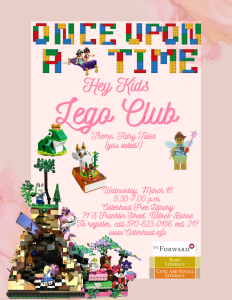 On Wednesday, March 18th, from 5:30-7PM, kids can join us in the Children’s Wing to build something Fairy Tale-themed at Lego Club! At the end of the night, your creations will be put on display until the next Lego Club meeting!